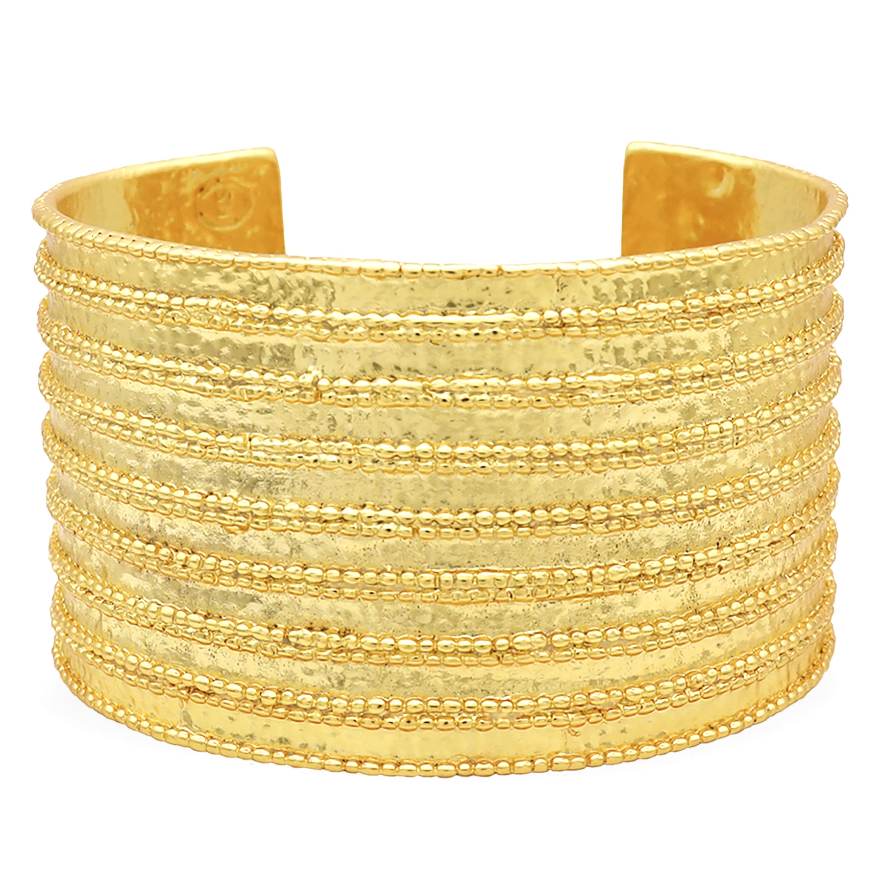 Fabriqué en métal doré poli, le motif à points en relief ajoute de la dimension et de la texture, transformant un brassard classique en un accessoire audacieux et élégant. Son design ouvert assure un ajustement confortable, tandis que son esthétique frappante mais raffinée le rend idéal pour la superposition ou le port en solo.