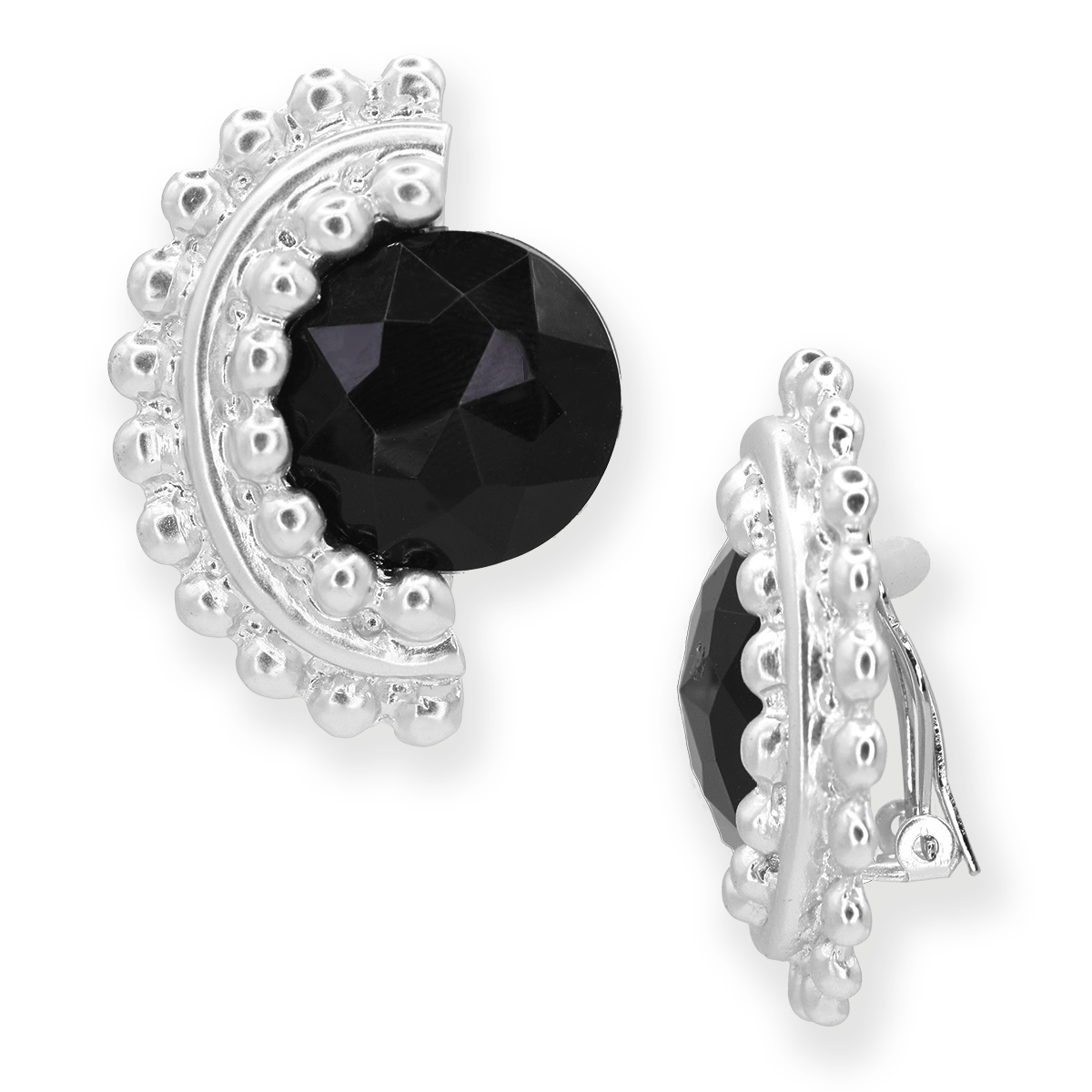 Boucles d’oreilles à clip en or avec un grand cristal noir central à facettes avec un pendentif de breloques en pièces de monnaie brossées et de perles en or.