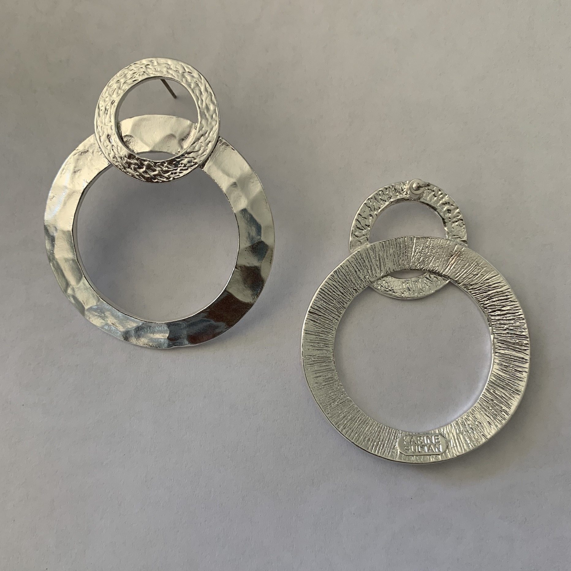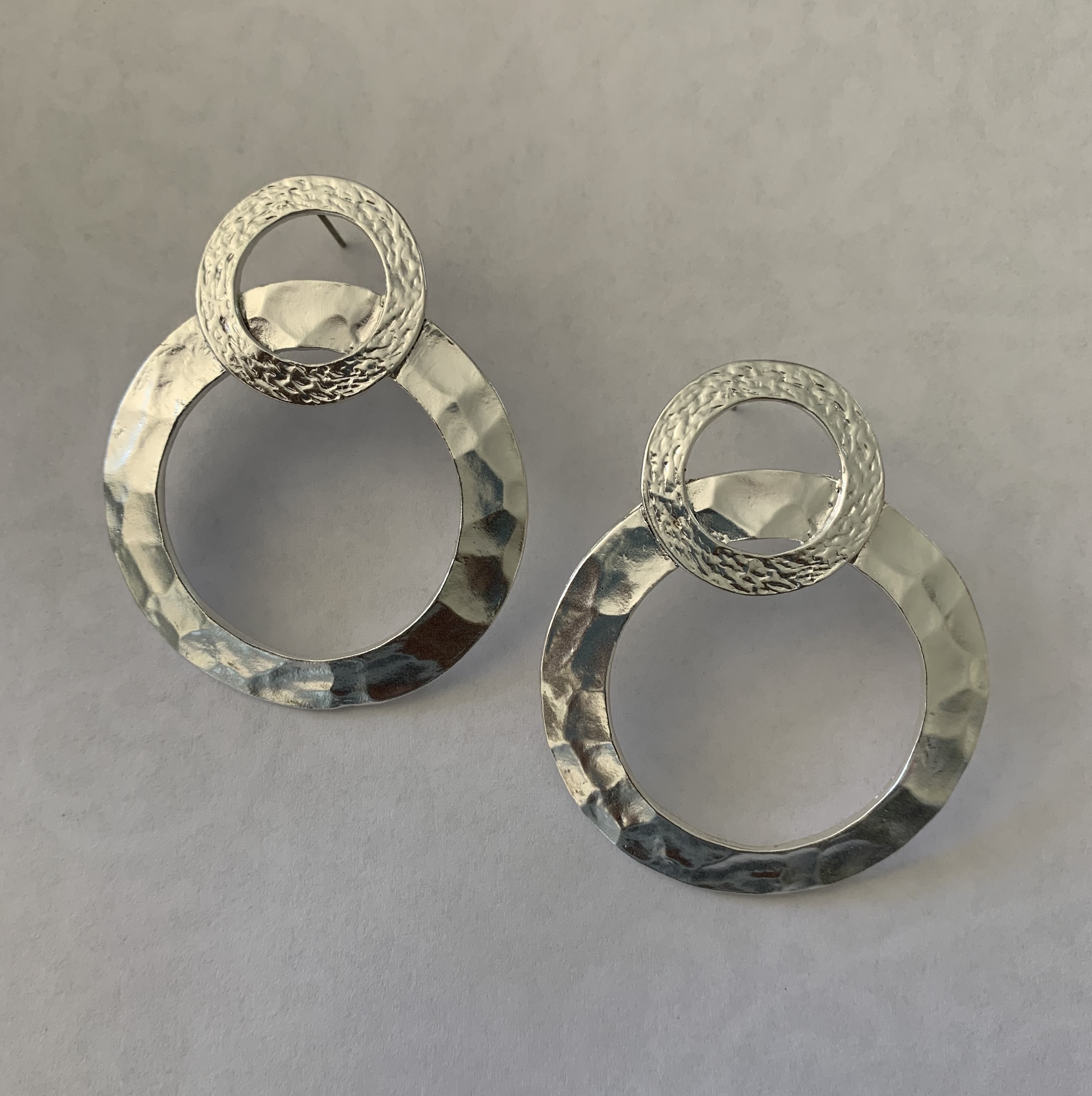 Boucles d’oreilles argentées à doubles anneaux avec effet martelé.